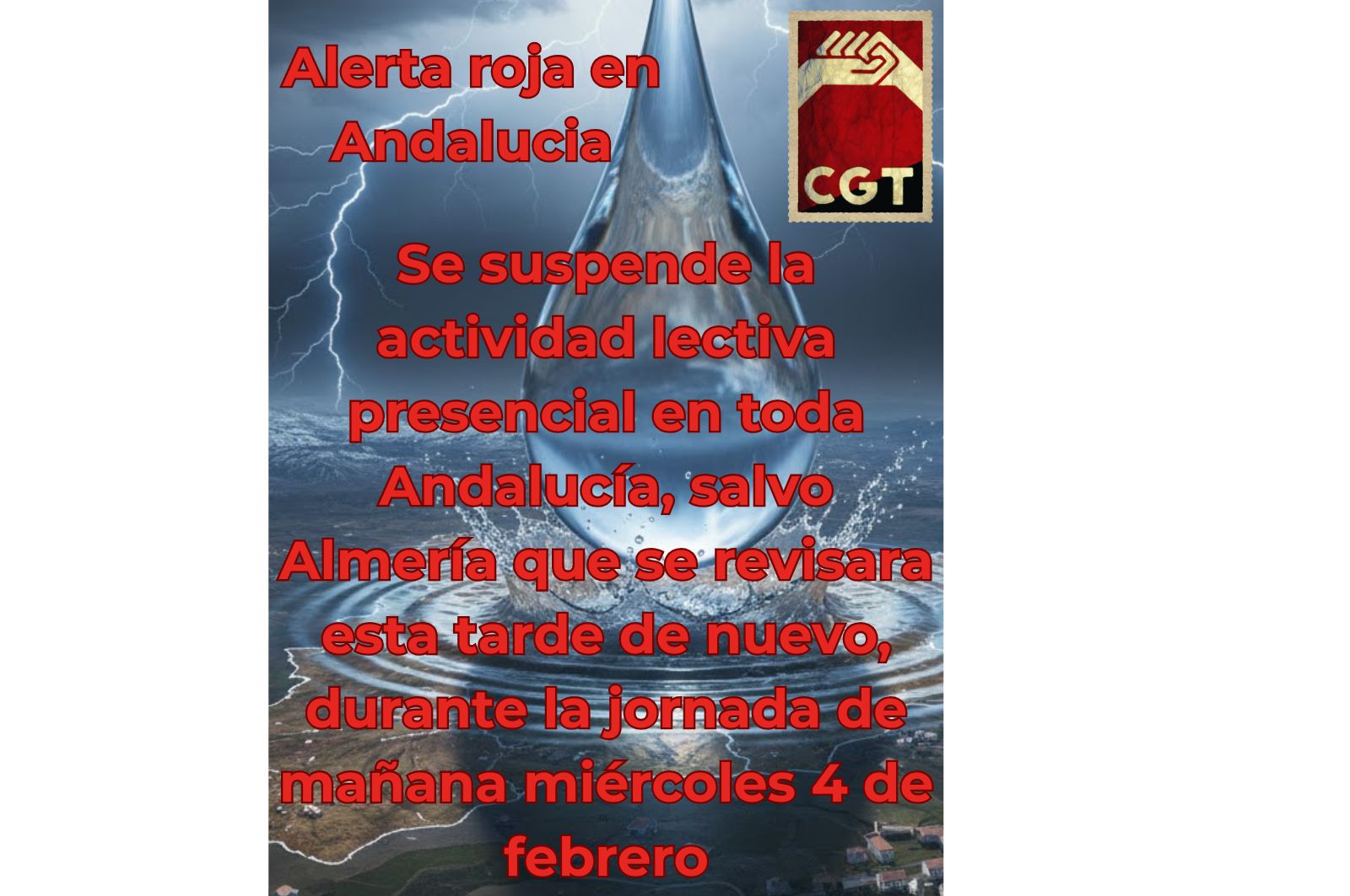 ACTIVIDAD SUSPENDIDA: Cádiz, Granada, Huelva, Jaén, Málaga, Córdoba y Sevilla. (Afecta a todos los centros educativos).