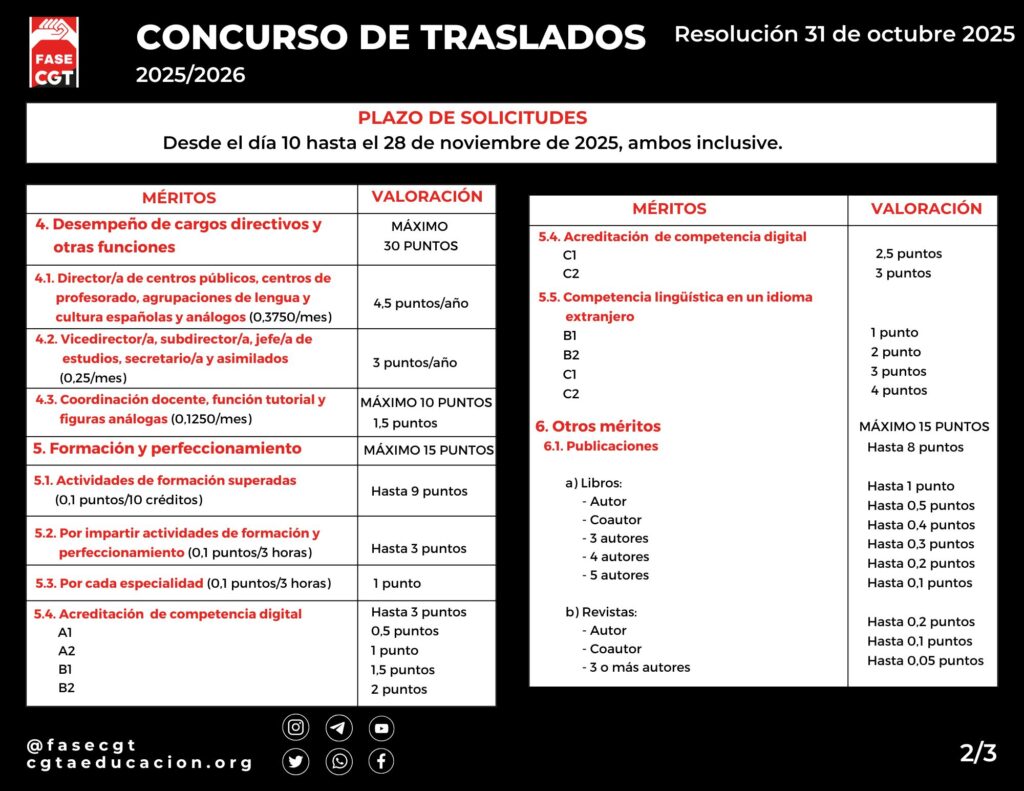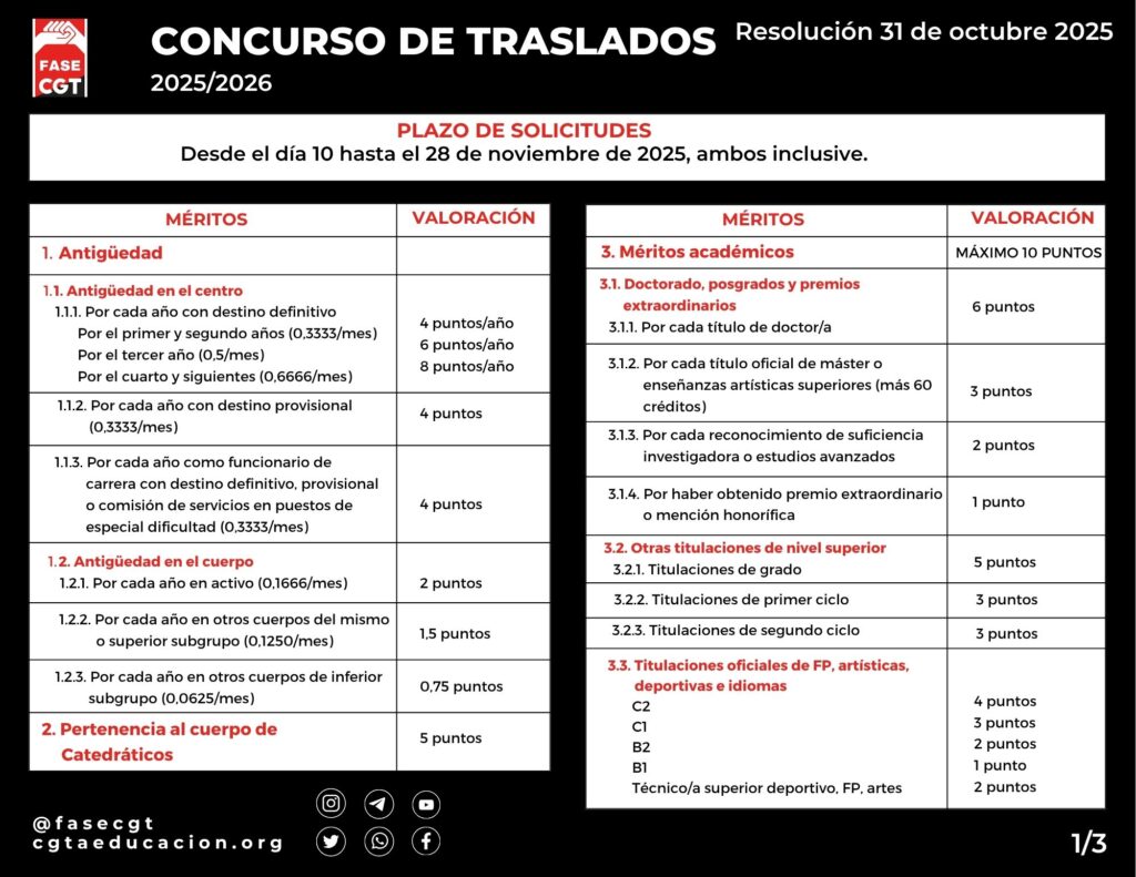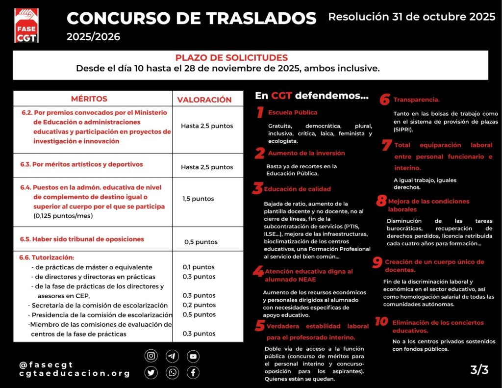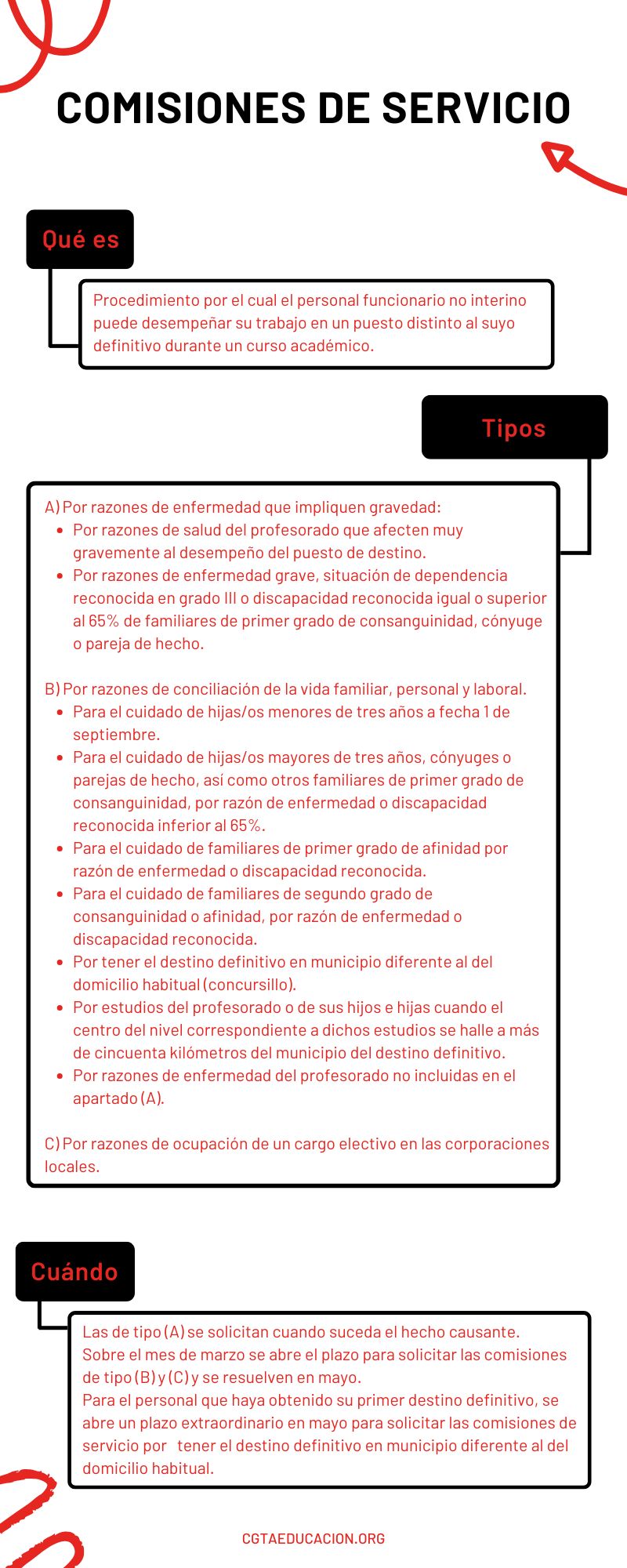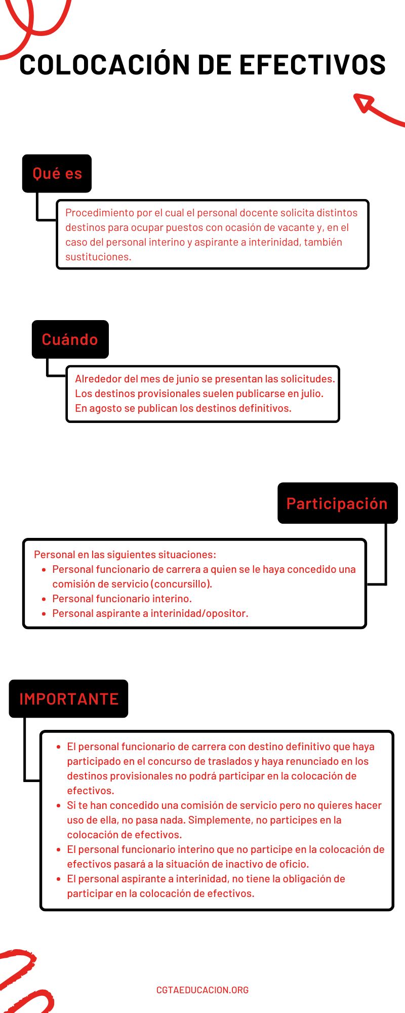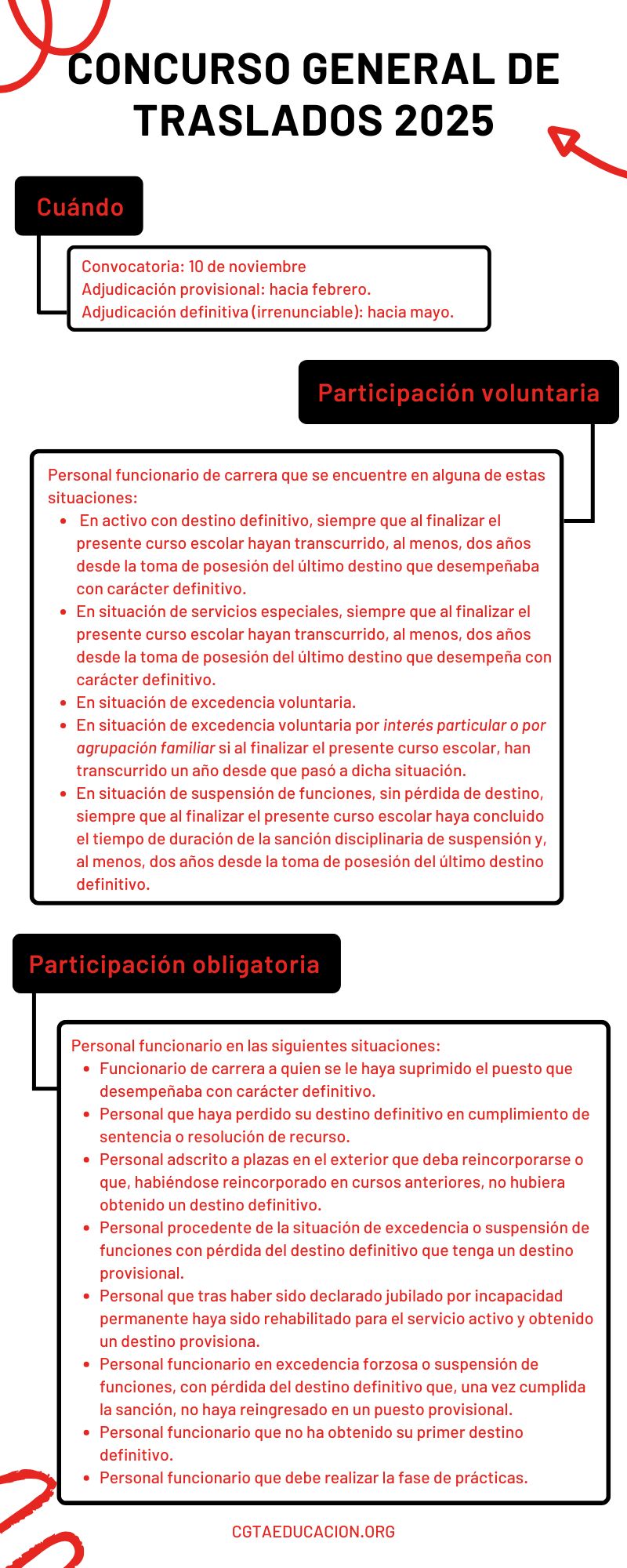 Te dejamos unas infografías para que puedas descargártelas con información general sobre el concurso de traslados (participación obligatoria y voluntaria), baremo del concurso de traslados de 2025, las comisiones de servicio (obligatorio participar en el concurso de traslados si luego quieres pedir concursillo) y la colocación de efectivos (también participan las interinas).