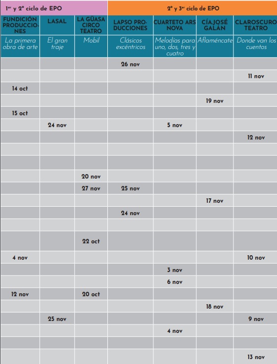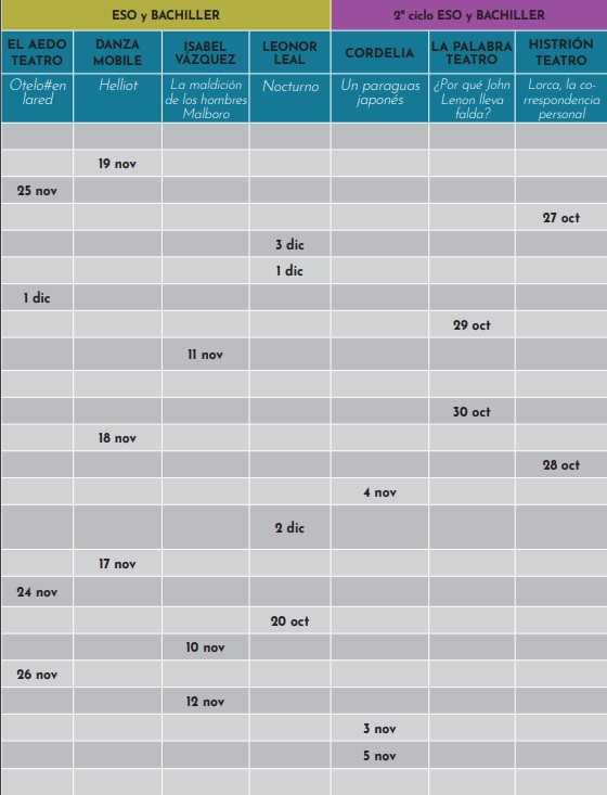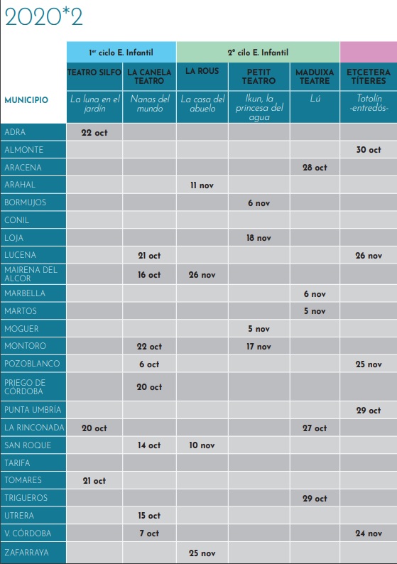 El programa Abecedaria, de la Red Andaluza de Teatros Públicos de la Consejería de Cultura y Patrimonio Histórico de la Junta de Andalucía, en colaboración con la Consejería de Educación y Deporte y los Ayuntamientos de los municipios participantes presenta 28 propuestas que abarcan a todos los ciclos educativos, desde los más pequeñitos, nuestros primeros espectadores de Escuelas Infantiles, hasta nuestros jóvenes de ESO y Bachiller: 9 compañías de teatro, 6 de Títeres y Objetos, 5 de Danza, 3 de Circo, 3 de Música y 2 de Flamenco.¿Cómo participar en el programa?