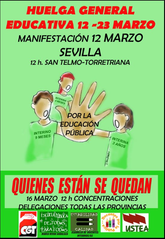 A partir de la huelga de febrero, se vienen produciendo distintas movilizaciones y sucesivas jornadas de Huelga por parte del profesorado interino andaluz. Huelga general del 12 al 23 de marzo siguiendo los acuerdos adoptados en la asamblea del personal docente