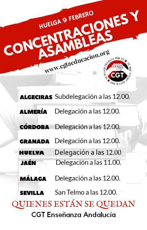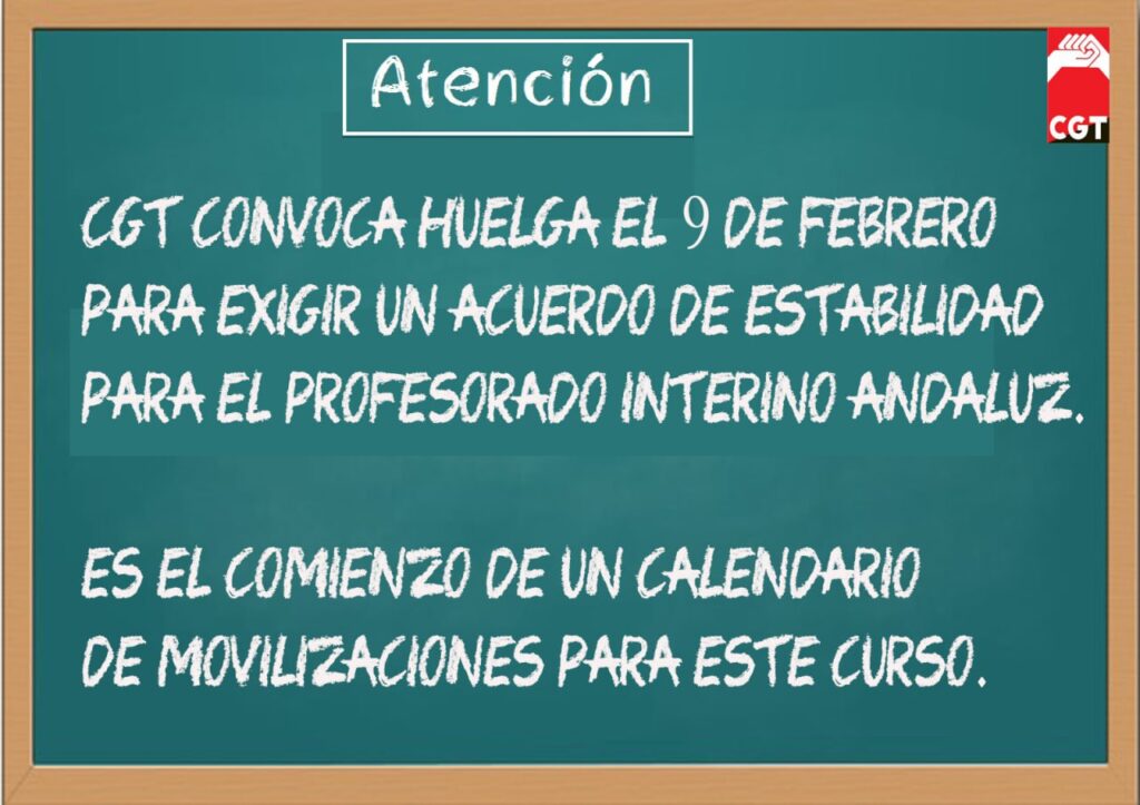 En 2018, CGT convoca huelga el 9 de febrero en la enseñanza andaluza para exigir a la Consejería un nuevo acuerdo de estabilidad del personal interino que garantice su continuidad en el trabajo.